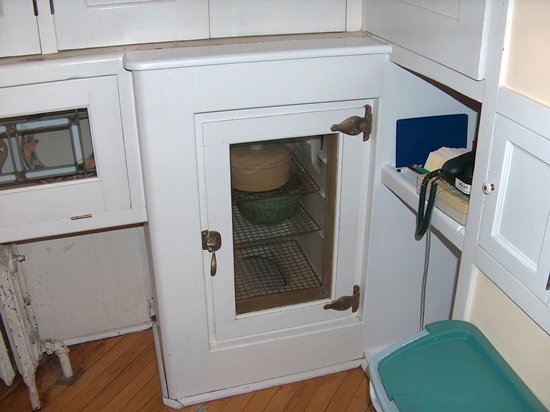 In the photo above you can see one of the modern kitchen conveniences that it contained… it is for cooling baked goods such as bread, pies, cakes and cookies. It is located adjacent to the “ice box” which is an insulated box that contains ice. (Go figure) Next to that on the left is an awesome kitchen convenience, shown below…