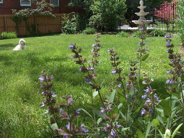 There in the sage blossoms somewhere is a really big bee, that’s what I was trying to get a picture of, but he wouldn’t hold still. Moreover, he didn’t mess with me either! You’ll notice the dog just sitting out there, he had a sore leg that day and the rabbit that I posted about a little ways back had given up on playing with him and gone off into those bushes back there in the corner. So, this is a picture of a beautiful spring afternoon in the back yard, you might even call it a carefree afternoon…
