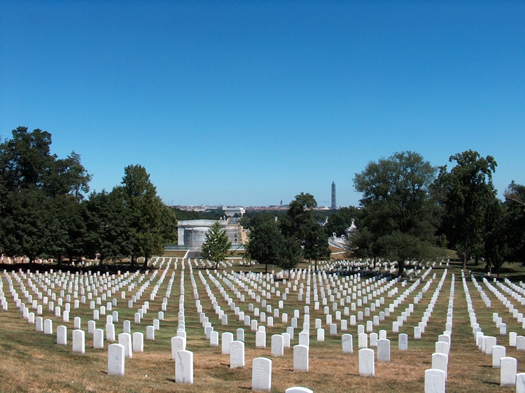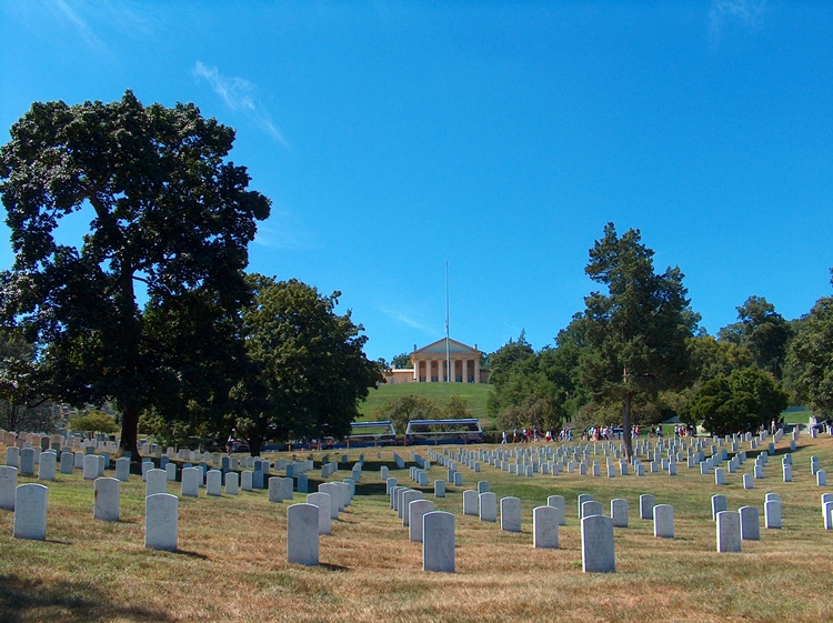 Many people don’t know it, but Arlington has an interesting history to it.  It was established during the Civil War, when Secretary of War Edwin M. Stanton ordered thousands of Union dead buried on this site.  He chose the site because it was the home of Confederate General Robert E. Lee, and Stanton wanted to make sure that General Lee would never return to his ancestral home overlooking Washington, DC  In his youth, George Washington himself was quite familiar with Arlington House (background above) where Lee would live, since he was distantly related to the Lee family.