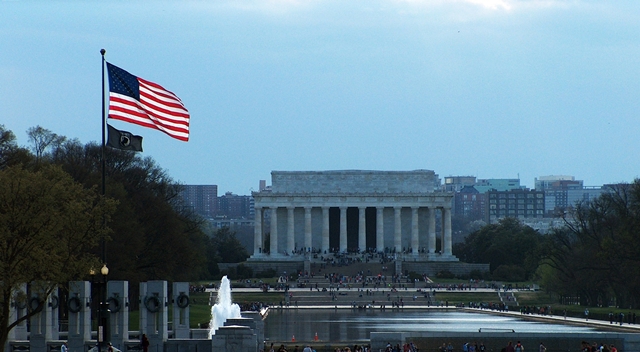 The first of these is the photo above. I took this about a month ago on a Friday evening. I was pleasantly surprised at the result, since I couldn’t be sure I was getting this scene. As you can see, the Lincoln Memorial is in the distance with part of the WW2 Memorial to the left where the flag is fluttering in the breeze, back-lit by the setting sun. I am standing at the base of the Washington Monument with full zoom, and as best I can tell, I got lucky!