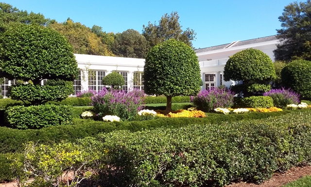 It was one of those afternoons that the Chamber of Commerce loves, for it was a glorious day; sunny with a few puffy clouds, a breeze with a hint of Fall and beauty all around. Over the years, I have been fortunate enough to have seen the White House both inside and out, but the one thing I’ve never had the opportunity to do is to walk around the South Lawn… until now. They let everyone in at the southwest gate, and though the ever-present security was all around, it was not at all ominous, in fact it was almost friendly, with both attendants and guards welcoming you to the White House as we entered. Yep, I must give credit where credit is due, the folks at the White house did a great job with this year’s Garden Tour.