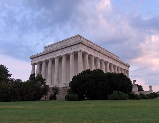 Here, the Lincoln Memorial has a pinkish hue as the sun struggles to poke out above the low clouds.