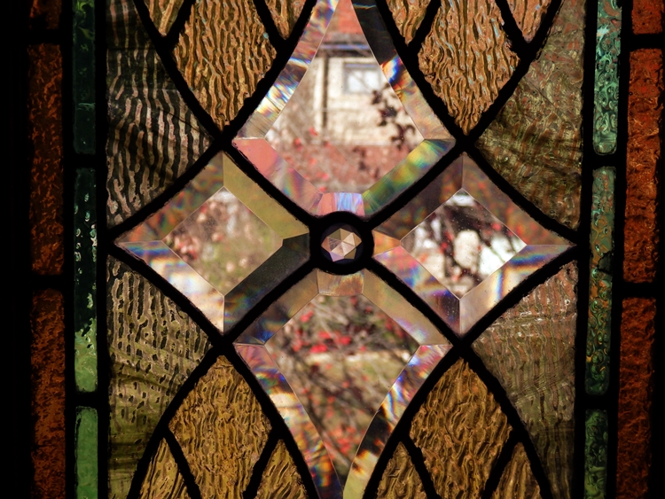 Looks like stained glass aka Lead lighting with a neighbours home seen through it?