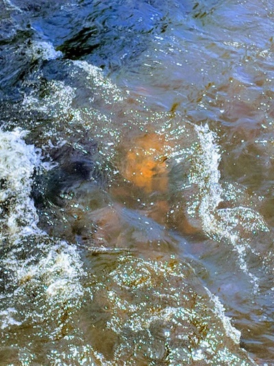 Looks to me like a gold fish. Below the shiny part that looks like a face I see what look a bit like a fin, but the pattern is not quite right.