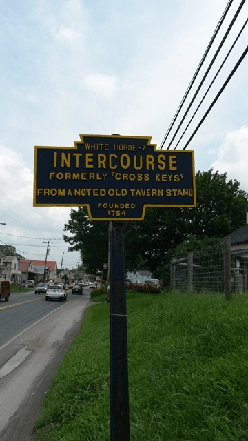 I don’t think I mentioned this in the July post, but I nearly met my end there in a little town called Intercourse, Pennsylvania. We wanted to get a photo of the town sign there, thinking no one would believe there would be a town with that name, so we pulled into a bank parking lot, and I took the camera and ran across the highway (US 30 as I recall) to get the shot. On the way back to the car, I had to wait seemingly forever to make a run for it, and when there was finally a break in the traffic, I bolted. I heard a noise, and looking up I saw that I wasn’t the only one with the same idea; there was a horse drawn wagon shooting right at me.